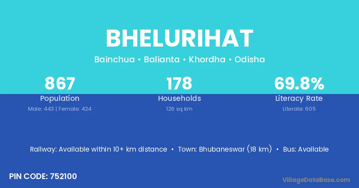 Bhubaneswar (18 km) is the nearest town to Bhelurihat village for major economic activities and is located approximately 18 km away.