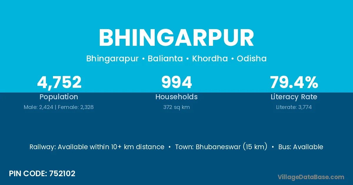Bhubaneswar (15 km) is the nearest town to Bhingarpur village for major economic activities and is located approximately 15 km away.