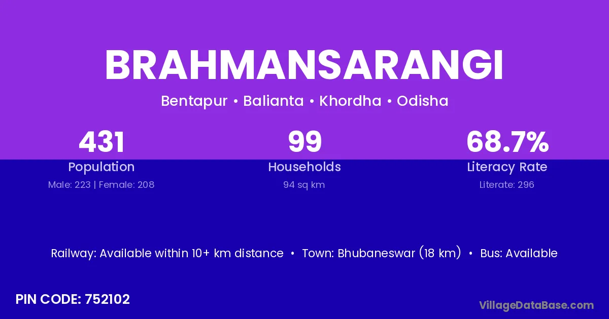 Brahmansarangi village has a total population of 431 people, of which 223 are males and 208 are females.