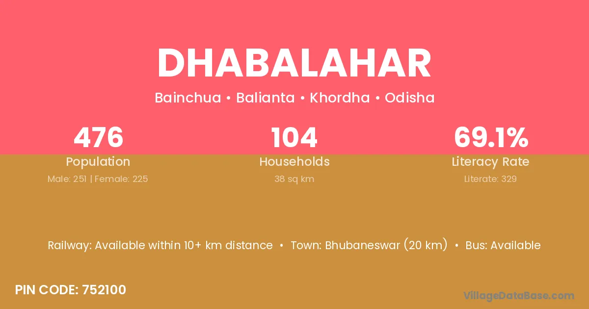Bhubaneswar (20 km) is the nearest town to Dhabalahar village for major economic activities and is located approximately 20 km away.