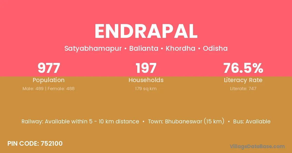 Bhubaneswar (15 km) is the nearest town to Endrapal village for major economic activities and is located approximately 15 km away.