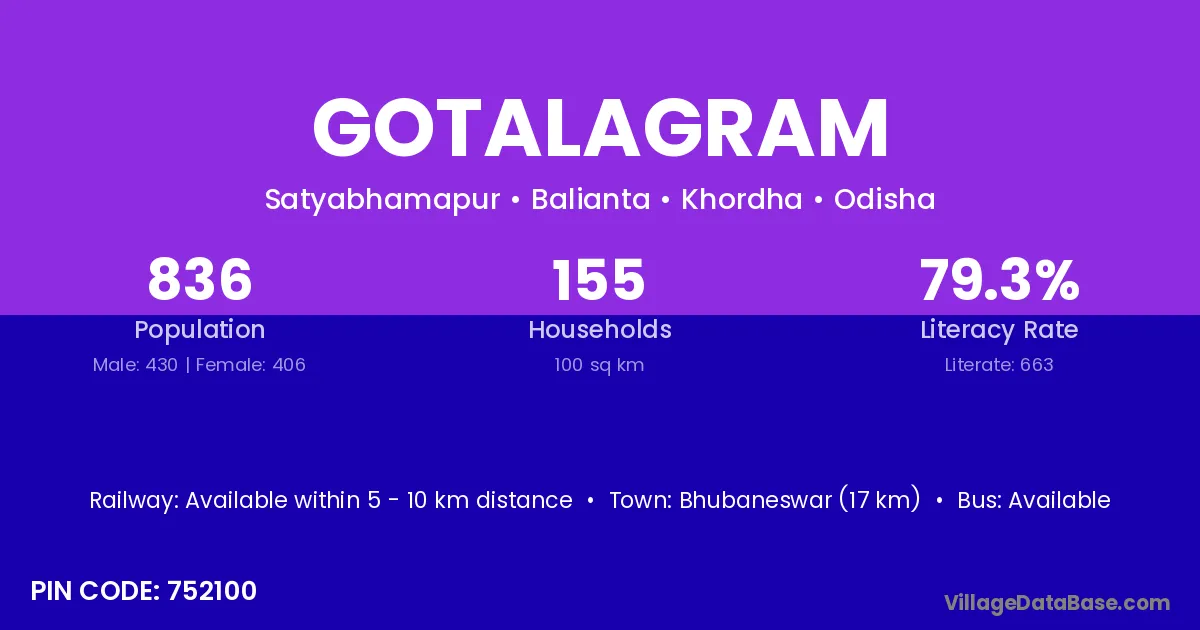 Bhubaneswar (17 km) is the nearest town to Gotalagram village for major economic activities and is located approximately 17 km away.