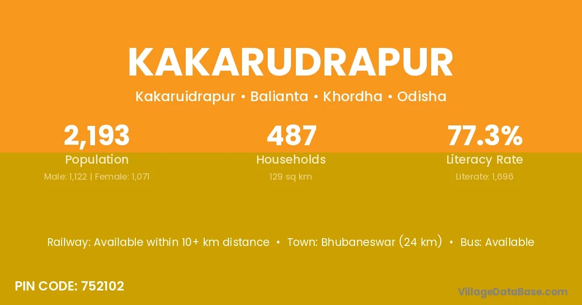 Bhubaneswar (24 km) is the nearest town to Kakarudrapur village for major economic activities and is located approximately 24 km away.