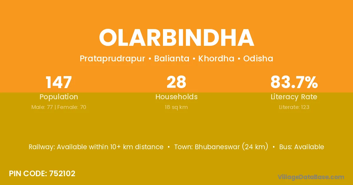Bhubaneswar (24 km) is the nearest town to Olarbindha village for major economic activities and is located approximately 24 km away.
