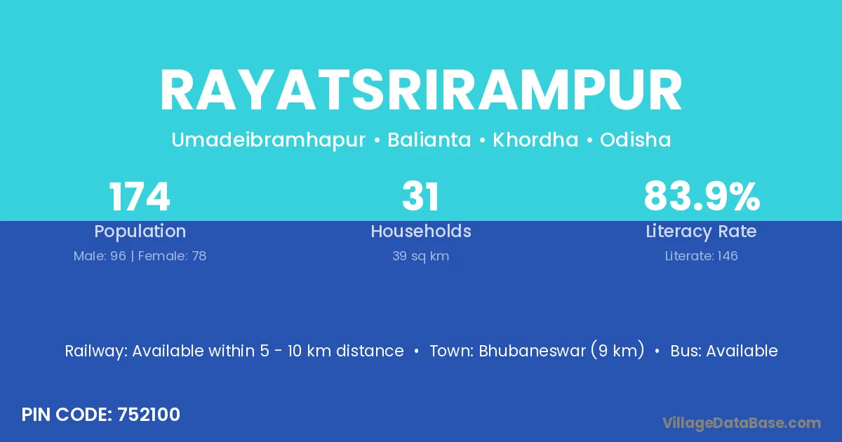Rayatsrirampur village has a total population of 174 people, of which 96 are males and 78 are females.