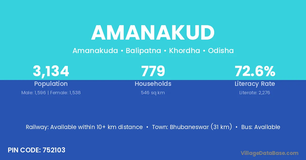 Bhubaneswar (31 km) is the nearest town to Amanakud village for major economic activities and is located approximately 31 km away.