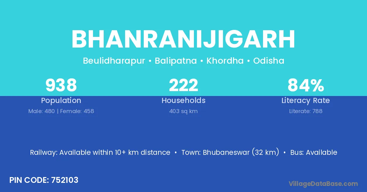 Bhubaneswar (32 km) is the nearest town to Bhanranijigarh village for major economic activities and is located approximately 32 km away.