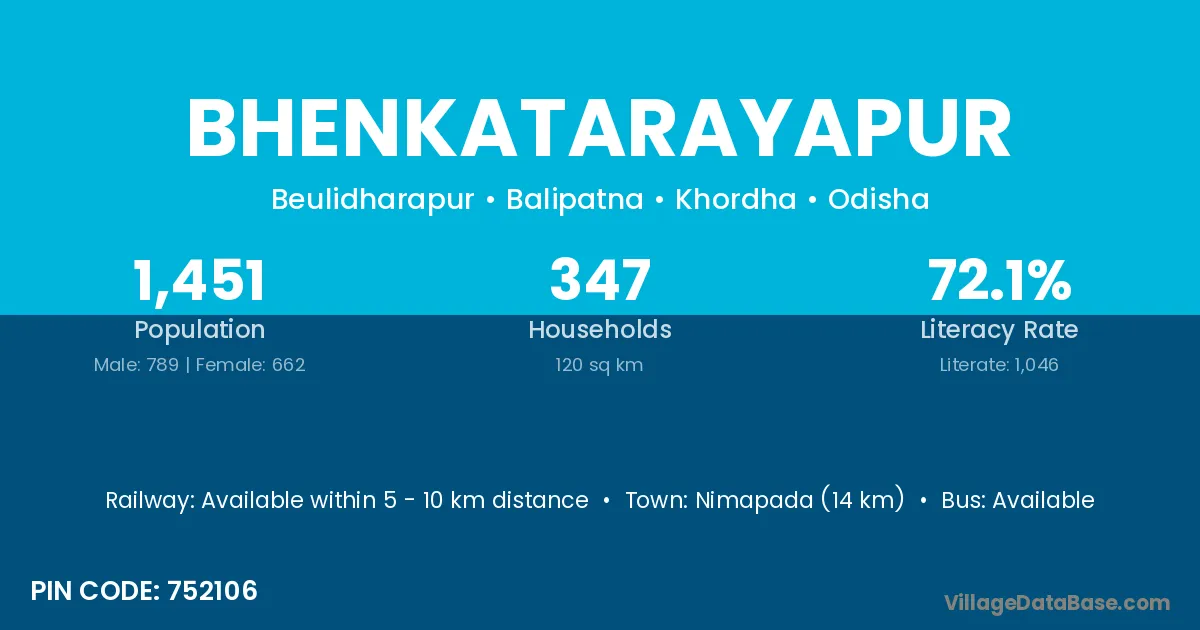 Nimapada (14 km) is the nearest town to Bhenkatarayapur village for major economic activities and is located approximately 14 km away.