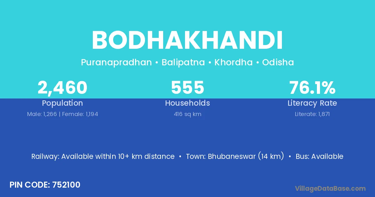 Bhubaneswar (14 km) is the nearest town to Bodhakhandi village for major economic activities and is located approximately 14 km away.