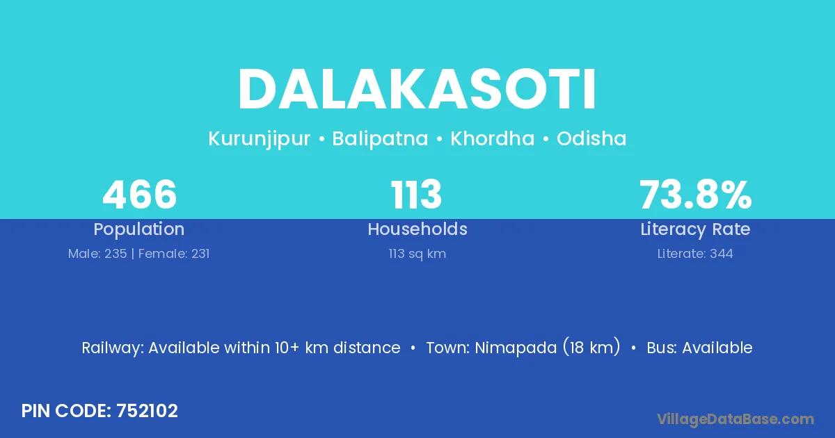 Dalakasoti village has a total population of 466 people, of which 235 are males and 231 are females.
