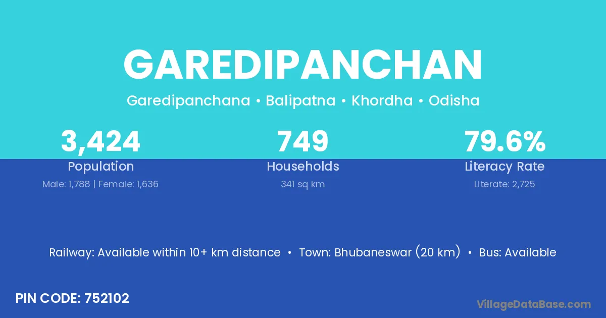 Bhubaneswar (20 km) is the nearest town to Garedipanchan village for major economic activities and is located approximately 20 km away.