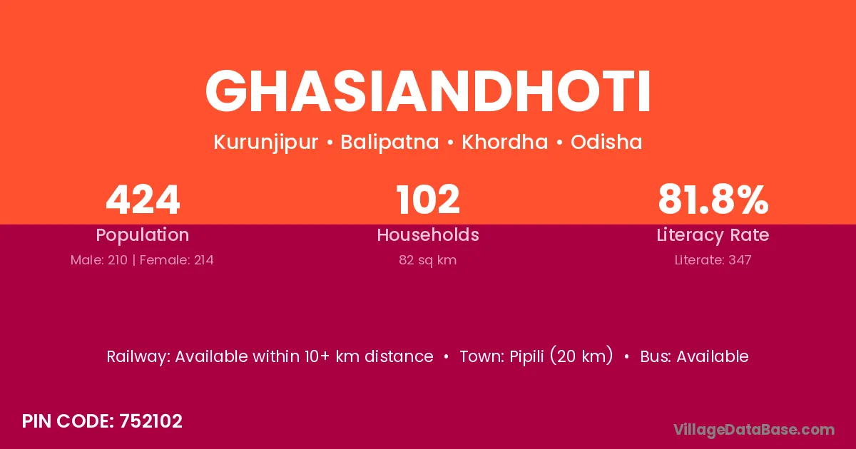 Pipili (20 km) is the nearest town to Ghasiandhoti village for major economic activities and is located approximately 20 km away.