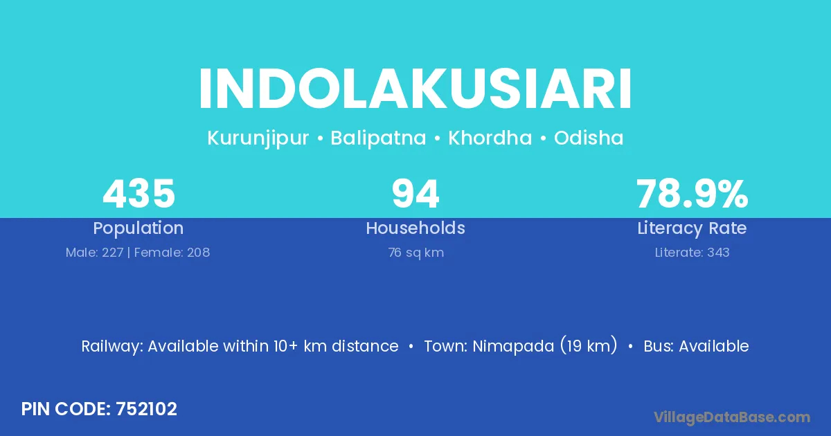Nimapada (19 km) is the nearest town to Indolakusiari village for major economic activities and is located approximately 19 km away.