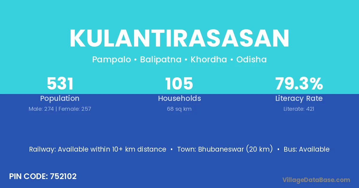 Bhubaneswar (20 km) is the nearest town to Kulantirasasan village for major economic activities and is located approximately 20 km away.