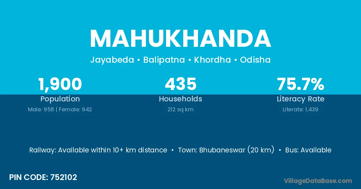 Bhubaneswar (20 km) is the nearest town to Mahukhanda village for major economic activities and is located approximately 20 km away.