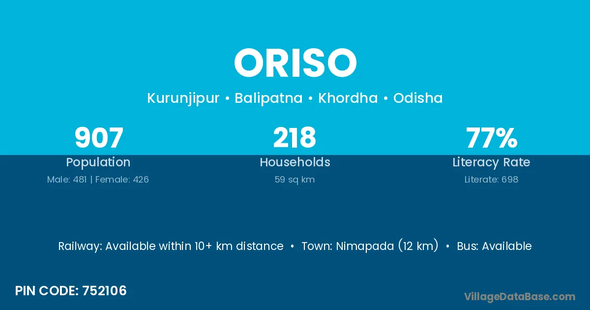 Nimapada (12 km) is the nearest town to Oriso village for major economic activities and is located approximately 12 km away.