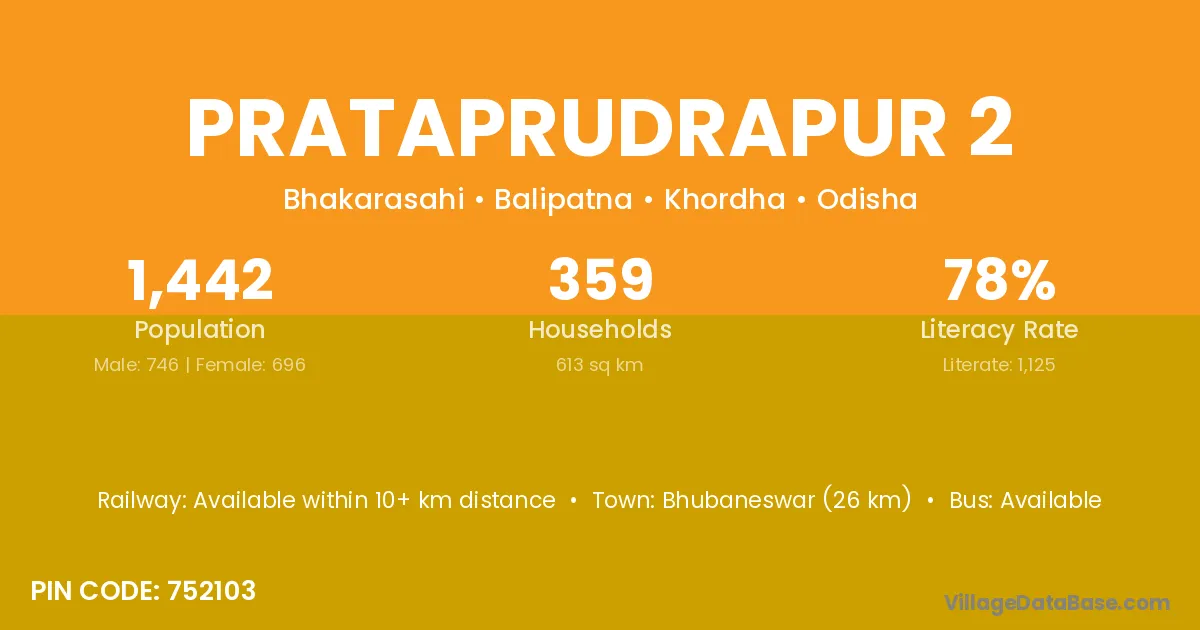 Bhubaneswar (26 km) is the nearest town to Prataprudrapur 2 village for major economic activities and is located approximately 26 km away.