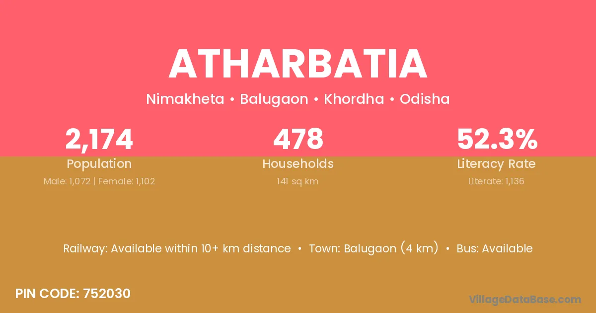Balugaon (4 km) is the nearest town to Atharbatia village for major economic activities and is located approximately 4 km away.