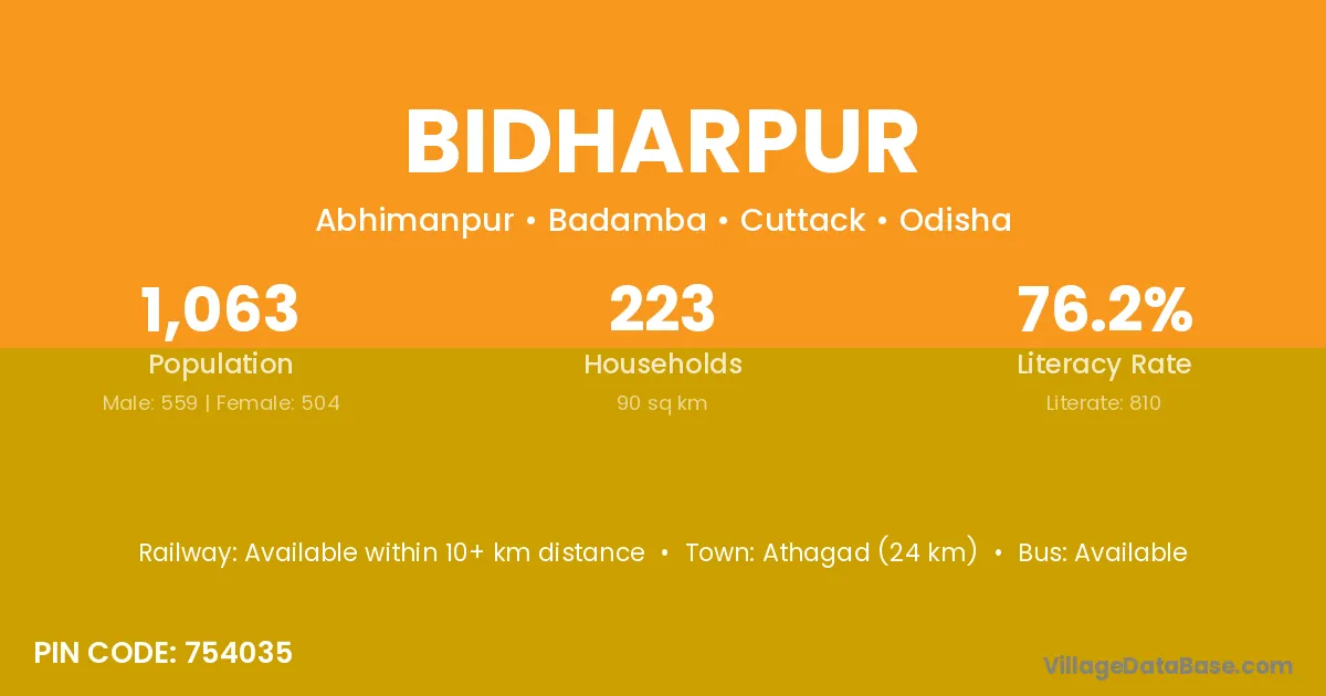 Balugaon (2 km) is the nearest town to Bidharpur village for major economic activities and is located approximately 2 km away.
