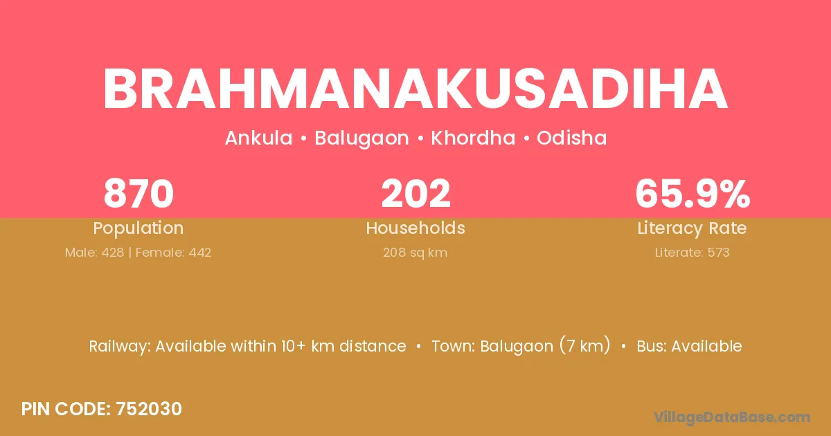 Brahmanakusadiha village has a total population of 870 people, of which 428 are males and 442 are females.
