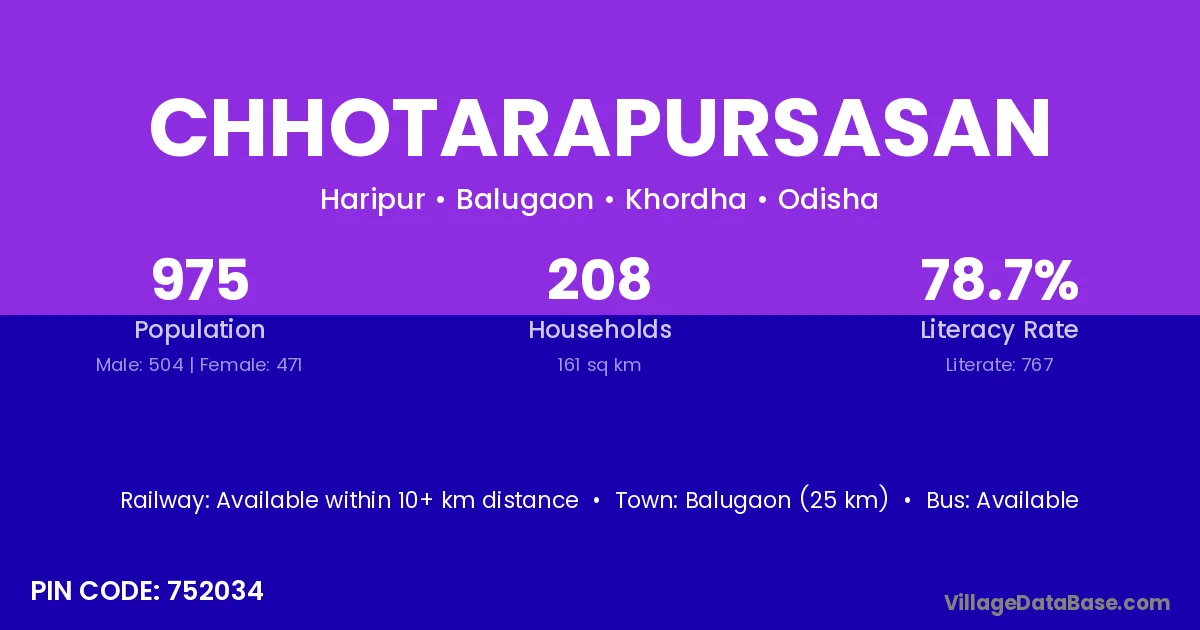Balugaon (25 km) is the nearest town to Chhotarapursasan village for major economic activities and is located approximately 25 km away.