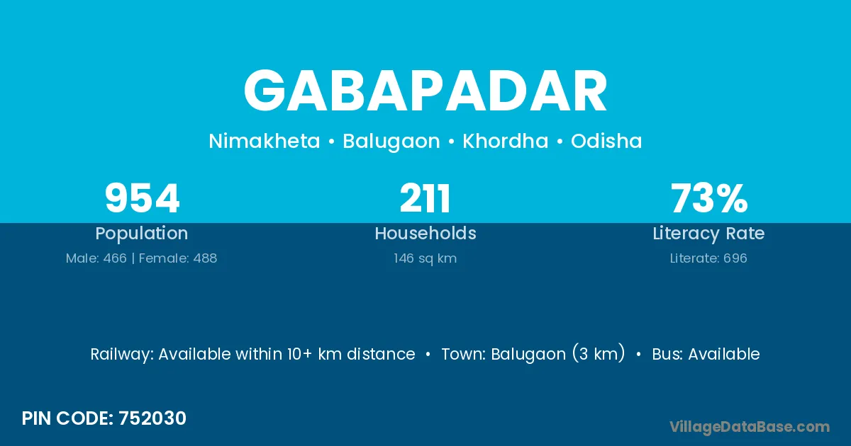 Balugaon (3 km) is the nearest town to Gabapadar village for major economic activities and is located approximately 3 km away.