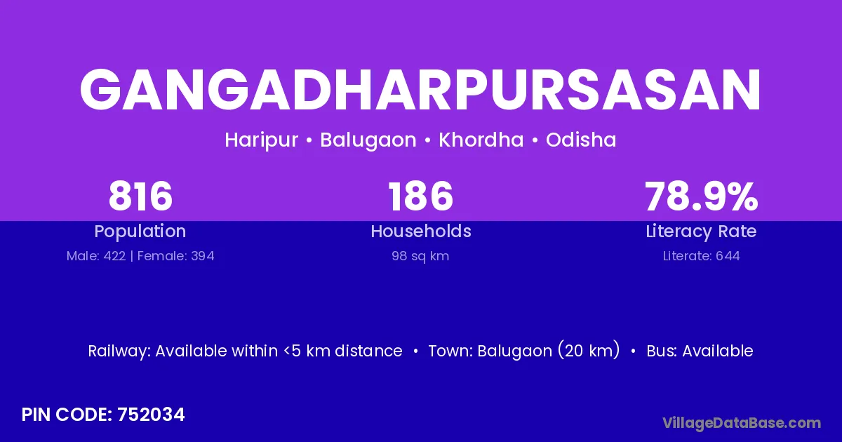 Balugaon (20 km) is the nearest town to Gangadharpursasan village for major economic activities and is located approximately 20 km away.