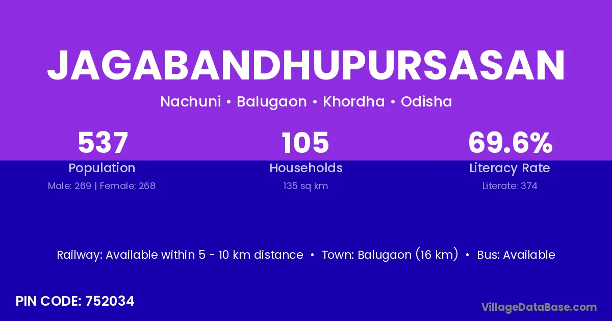 Balugaon (16 km) is the nearest town to Jagabandhupursasan village for major economic activities and is located approximately 16 km away.