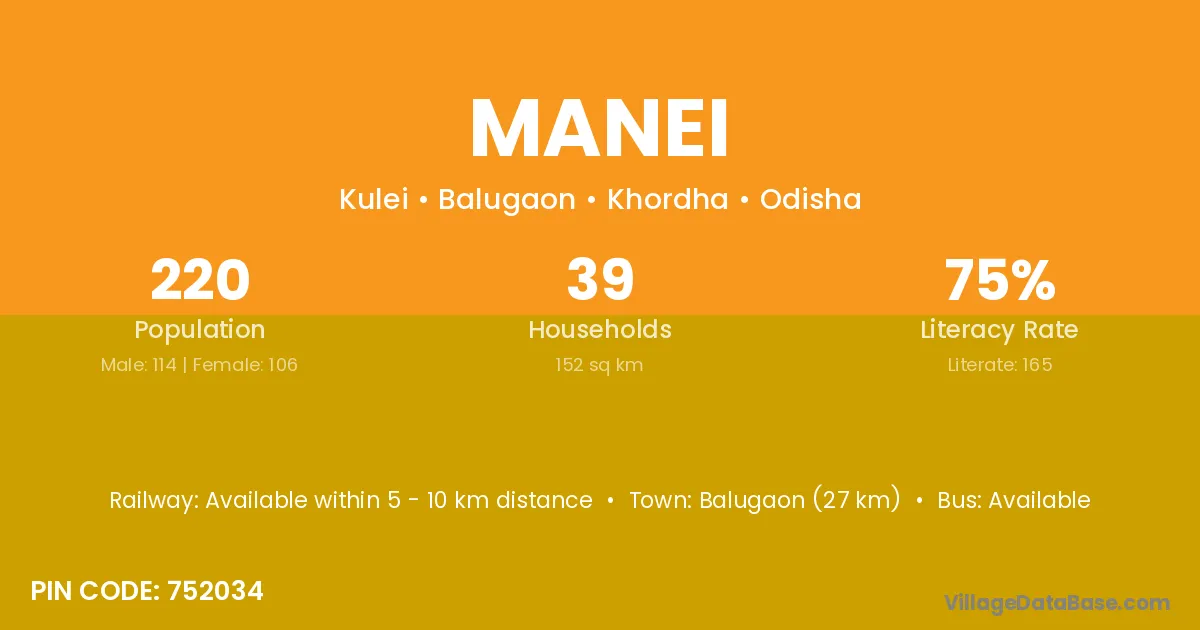 Balugaon (27 km) is the nearest town to Manei village for major economic activities and is located approximately 27 km away.