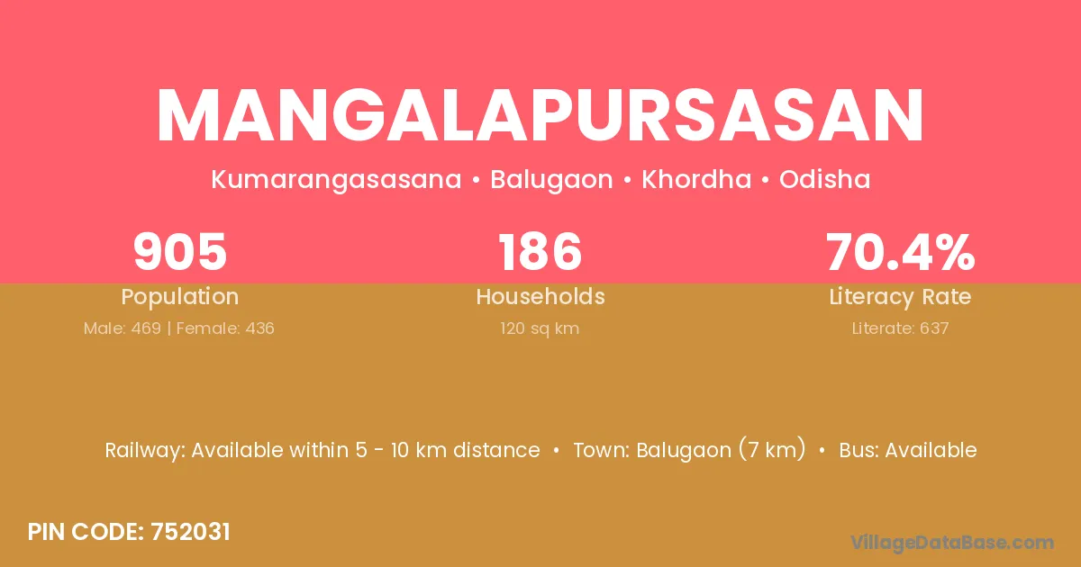 Balugaon (7 km) is the nearest town to Mangalapursasan village for major economic activities and is located approximately 7 km away.