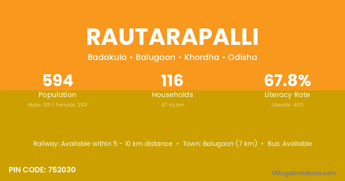Balugaon (7 km) is the nearest town to Rautarapalli village for major economic activities and is located approximately 7 km away.