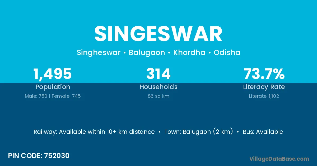 Balugaon (2 km) is the nearest town to Singeswar village for major economic activities and is located approximately 2 km away.