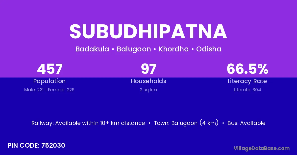 Subudhipatna village has a total population of 457 people, of which 231 are males and 226 are females.