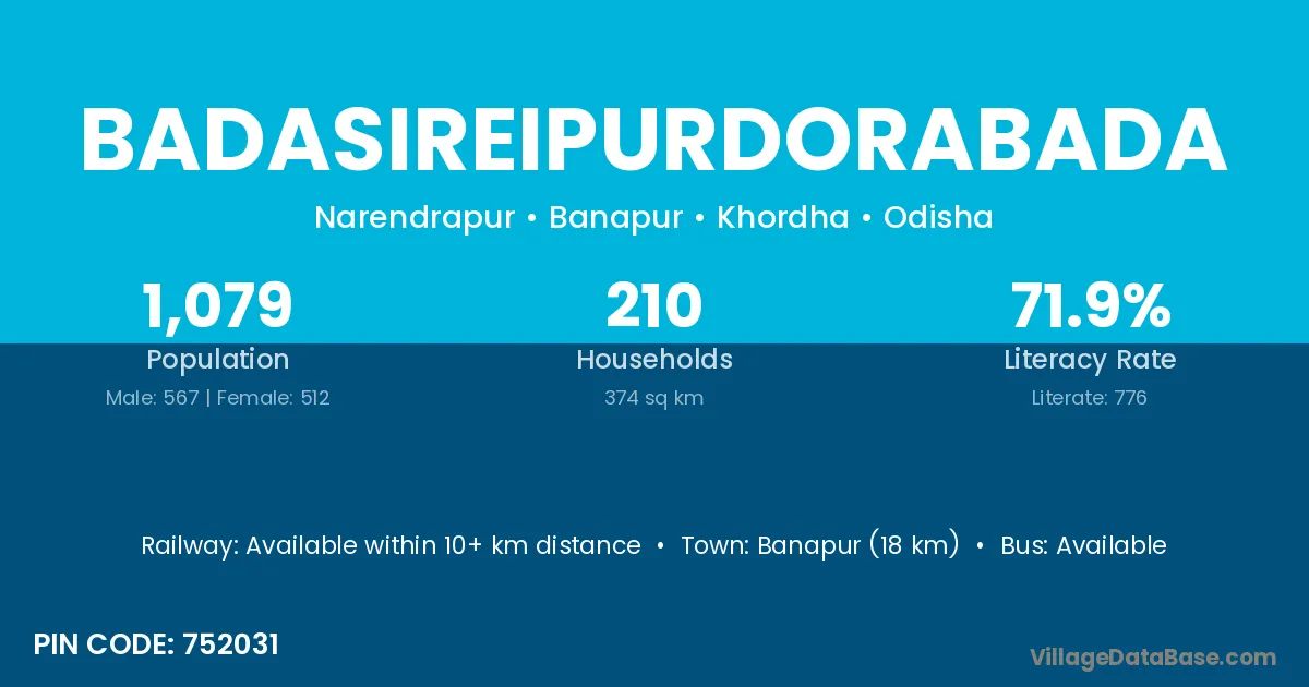 Banapur (18 km) is the nearest town to Badasireipurdorabada village for major economic activities and is located approximately 18 km away.