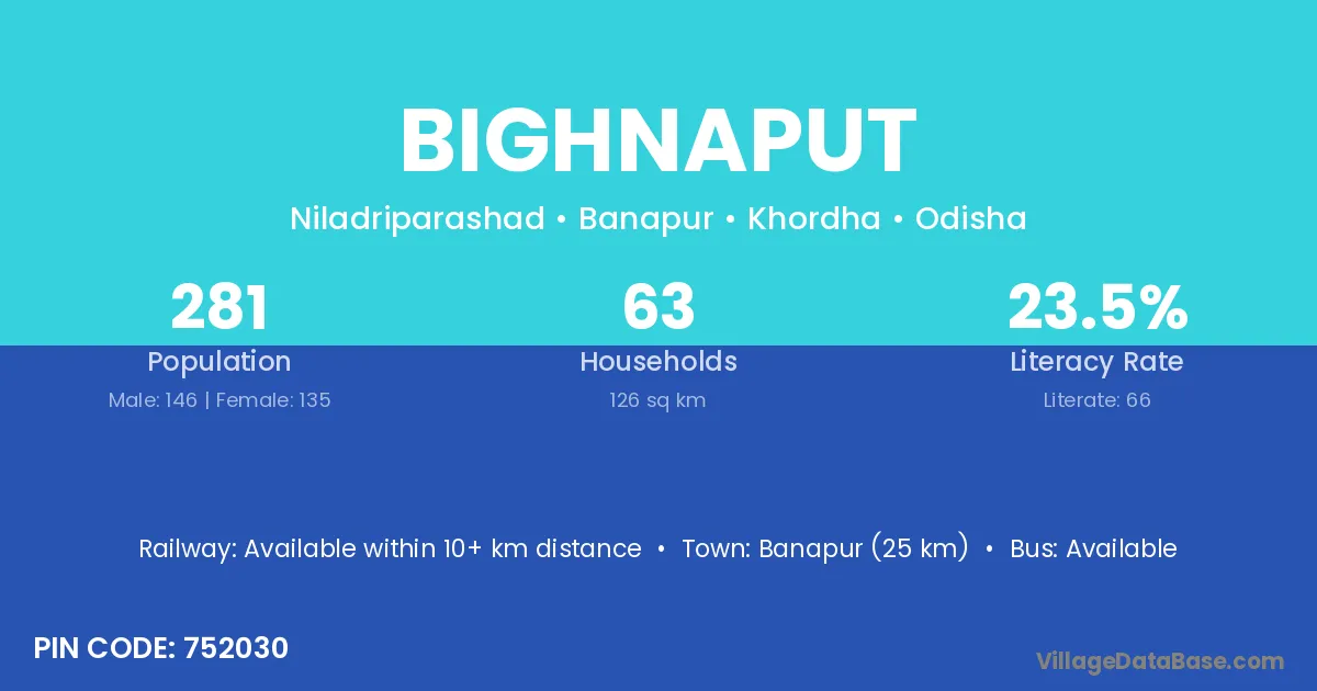 Banapur (25 km) is the nearest town to Bighnaput village for major economic activities and is located approximately 25 km away.