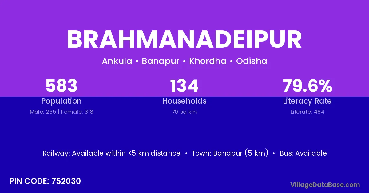 Banapur (5 km) is the nearest town to Brahmanadeipur village for major economic activities and is located approximately 5 km away.