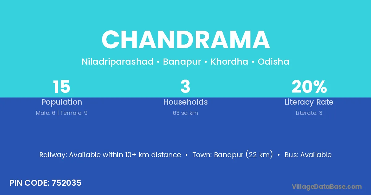 Banapur (22 km) is the nearest town to Chandrama village for major economic activities and is located approximately 22 km away.