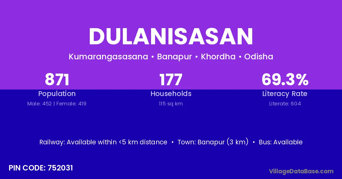 Banapur (3 km) is the nearest town to Dulanisasan village for major economic activities and is located approximately 3 km away.
