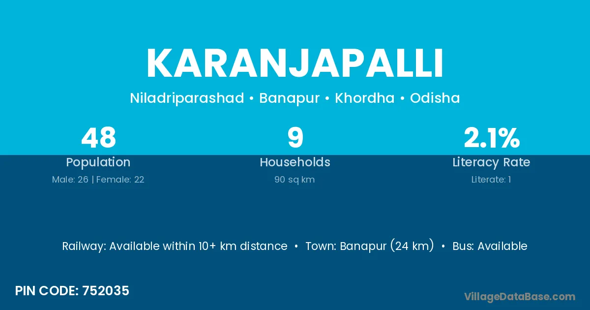 Banapur (24 km) is the nearest town to Karanjapalli village for major economic activities and is located approximately 24 km away.
