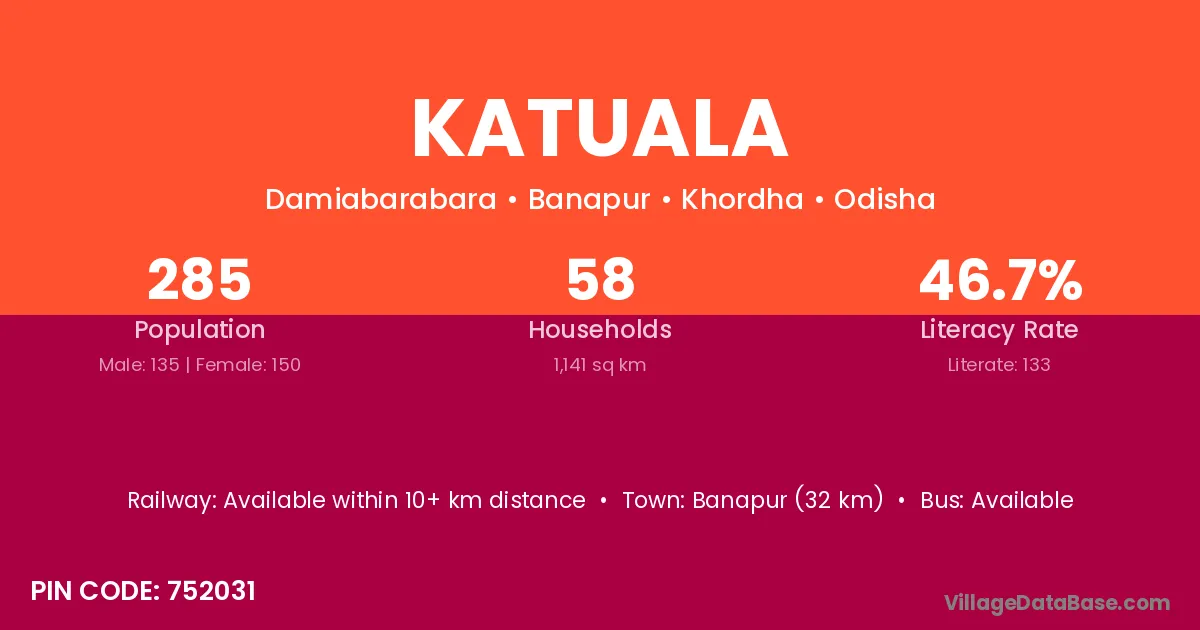 Banapur (32 km) is the nearest town to Katuala village for major economic activities and is located approximately 32 km away.