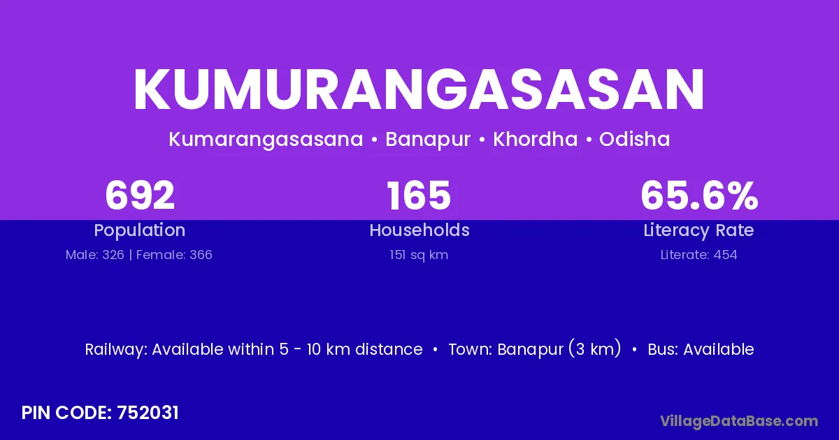 Banapur (3 km) is the nearest town to Kumurangasasan village for major economic activities and is located approximately 3 km away.