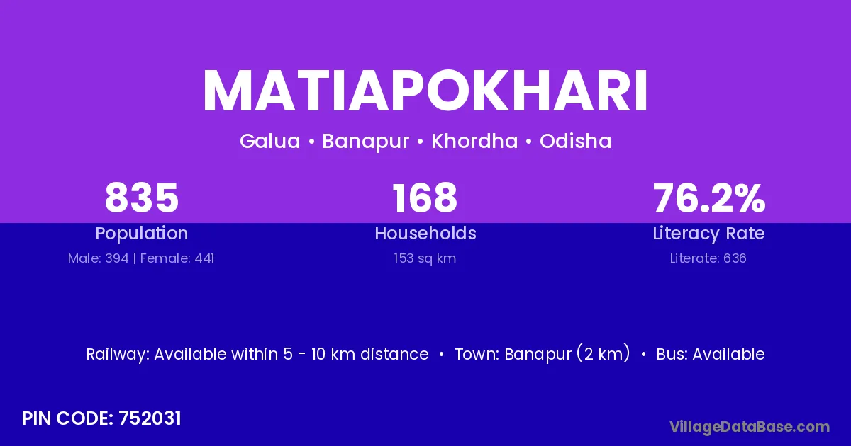 Banapur (2 km) is the nearest town to Matiapokhari village for major economic activities and is located approximately 2 km away.