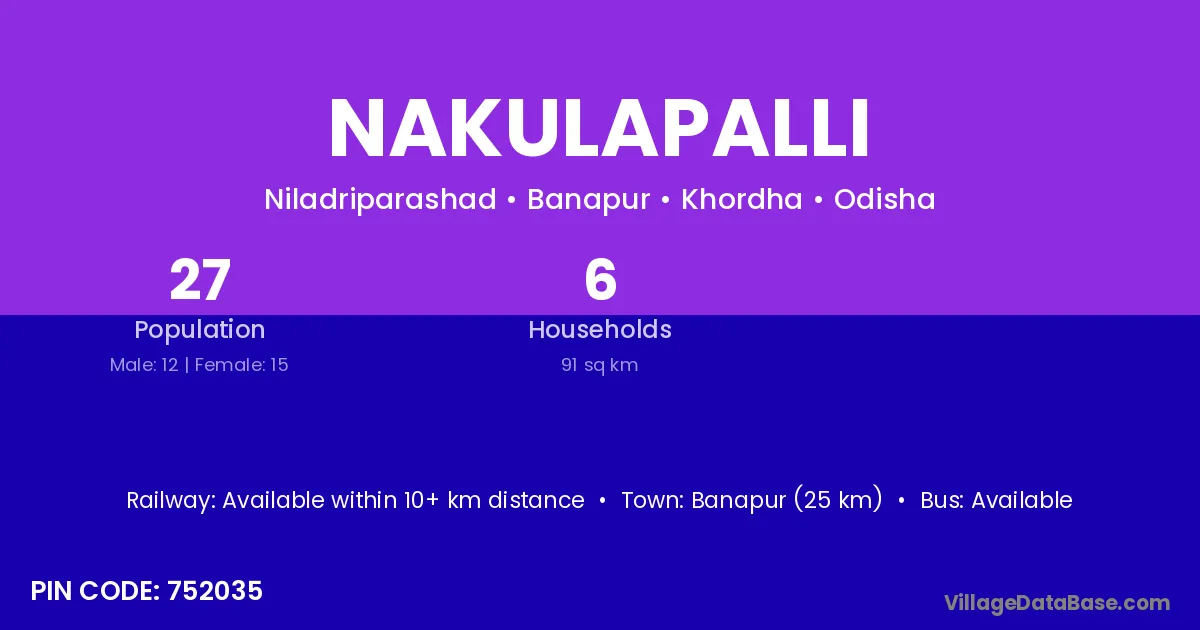 Banapur (25 km) is the nearest town to Nakulapalli village for major economic activities and is located approximately 25 km away.