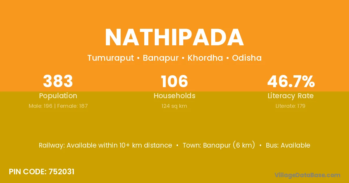 Banapur (6 km) is the nearest town to Nathipada village for major economic activities and is located approximately 6 km away.