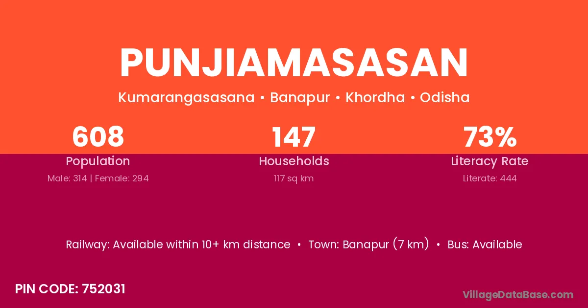 Banapur (7 km) is the nearest town to Punjiamasasan village for major economic activities and is located approximately 7 km away.