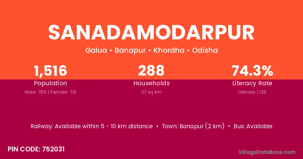 Banapur (2 km) is the nearest town to Sanadamodarpur village for major economic activities and is located approximately 2 km away.