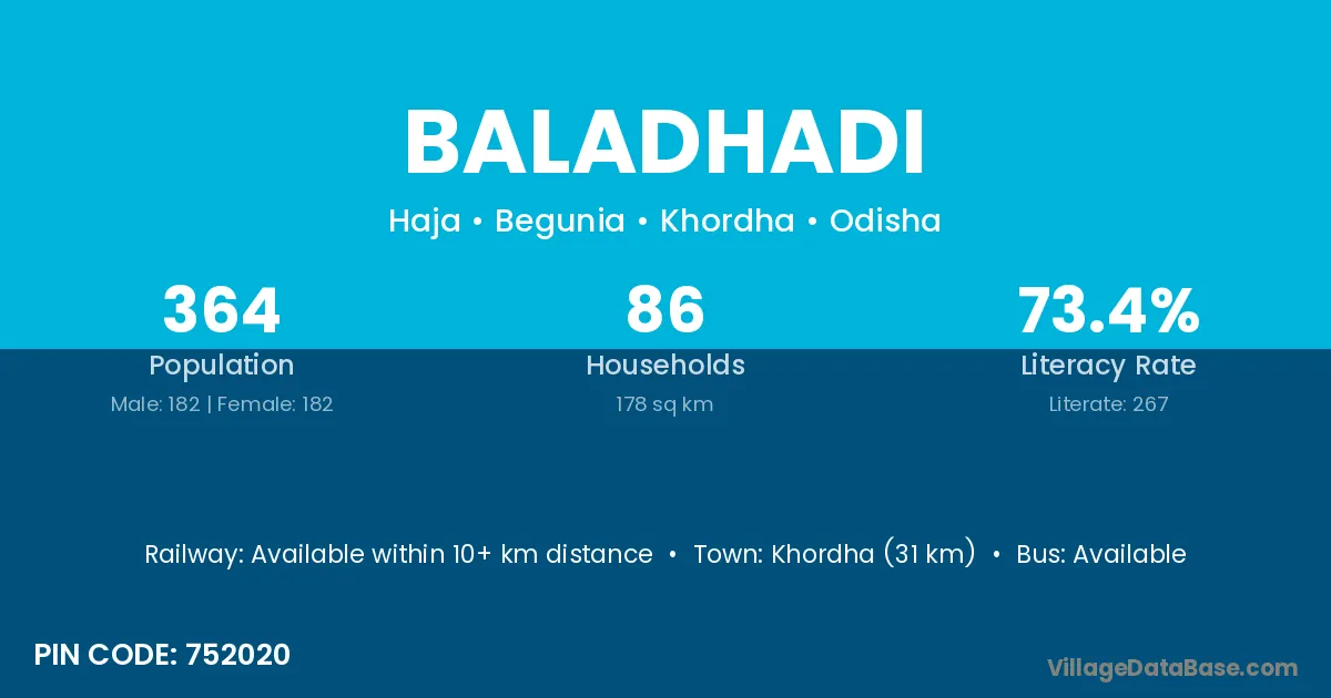 Khordha (31 km) is the nearest town to Baladhadi village for major economic activities and is located approximately 31 km away.