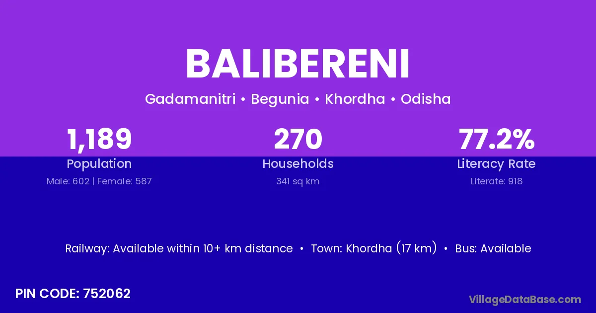 Khordha (17 km) is the nearest town to Balibereni village for major economic activities and is located approximately 17 km away.