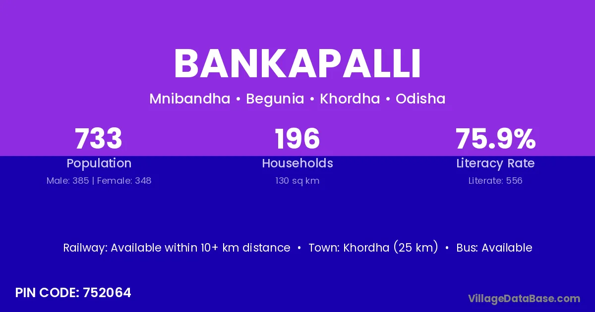 Khordha (25 km) is the nearest town to Bankapalli village for major economic activities and is located approximately 25 km away.