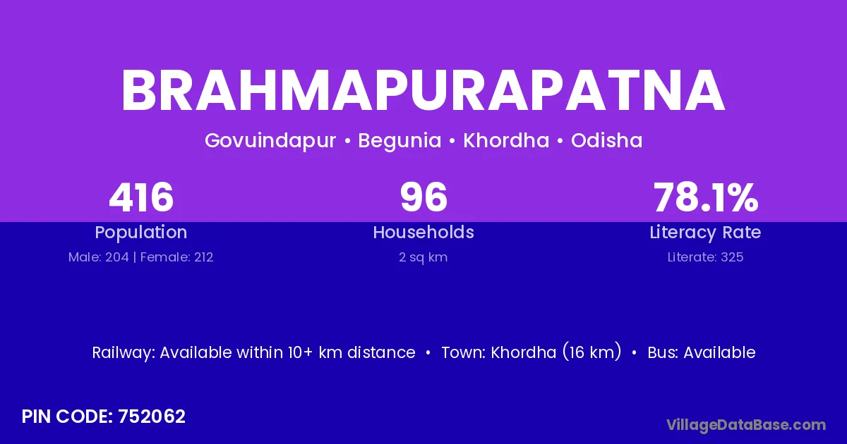 Khordha (16 km) is the nearest town to Brahmapurapatna village for major economic activities and is located approximately 16 km away.